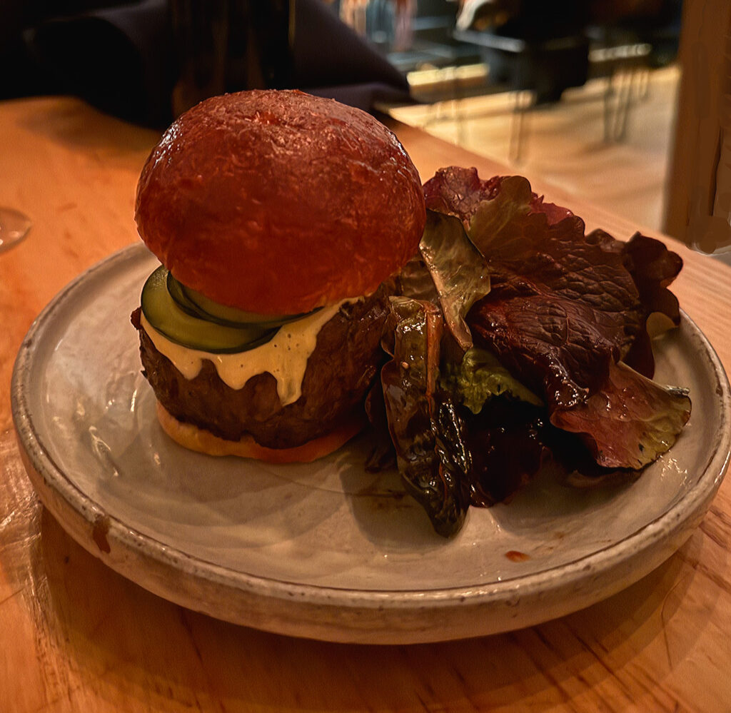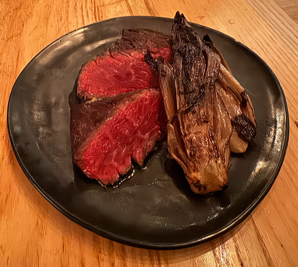 Tonight, the patty (presumably made from the trimmings of the rotating steaks the restaurant serves) comes out looking particularly thick. Nonetheless, the meat is framed by the kitchen’s classic set of accompaniments: caramelized onion, aioli, bread-and-butter pickles, and optional Werp Farms greens all stacked between a house bun. This yields a textural experience that is a touch firm on entry yet moist, crisp, juicy, and even creamy with further mastication. Flavor, too, leads with the intensely savory, satisfaction character of the patty but tends toward soothing sweetness and a complicating kick of acid as one incorporates all the elements. Ultimately, I’ve certainly preferred bolder iterations of this dish in the past (one with pickled Fresno chiles for example). Still, this version—so traditionally composed—ranks among the very best I have sampled here.
