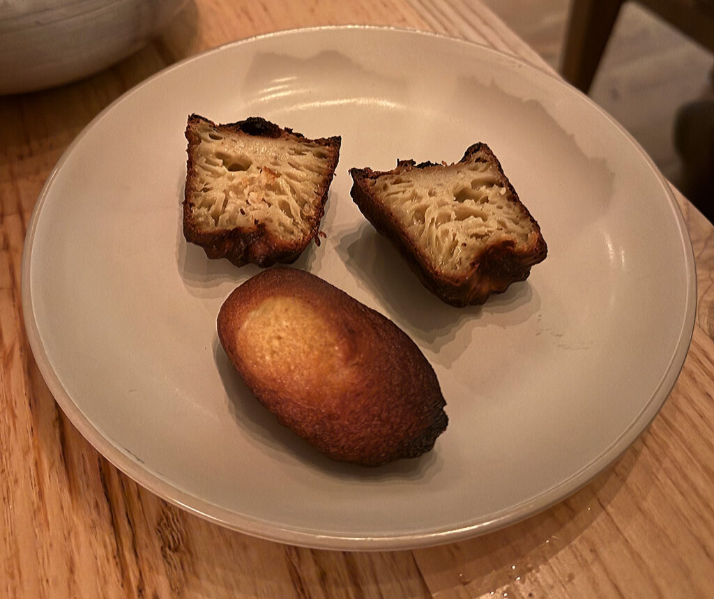This evening’s selection begins with a “Wolf Point Whiskey Canelé” ($6) and a “Madeleine” ($1.50)—daintier items through which the chefs can showcase classic techniques and reward diners who might only want a smaller bite (or, alternatively, to build an elaborate spread).