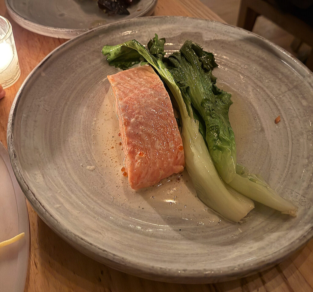 Of all the entrées I have tasted across my visits, fish tend to be the ones that overperform (perhaps because the team’s adventurousness blends so well with what is otherwise a blank canvas). Indeed, the “Poached Petuna Ocean Trout” ($42) is remarkably rich and creamy when it hits my tongue (ranking, certainly, among the most elegant fillets I have encountered), yet its latent flavor is rather mild. The accompanying leaves of braised escarole—fleeting crunchy but every bit as buttery in their own right—add an intriguing tinge of bitterness to the recipe. However, it’s the smoked trout fumet (essentially a concentrated stock) that lets the preparation down: moistening the components on the plate without imbuing them with any of the savory concentration necessary to enliven the interior of the trout. For me, the dish’s marvelous textures are let down by an overall blandness (though I concede this may be a simple matter of taste).