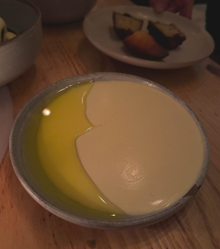Tonight’s meal starts as it always does: with that most traditional, unassuming symbol of the baking craft (and one, so ever-changing in its expression here, that almost acts as a microcosm of the entire restaurant). Pikas’s present iteration is titled “Sprouted Oat Porridge Bread & Kefir Cultured Butter” ($10) and comes listed with optional pairings like “Brown Anchovy” ($6), “Fontina” ($6), “Pickles” ($6), and “Gordal Olive Escabeche” ($7). On this occasion, I skip the latter two (being familiar with them from my past visits) and opt for what’s new—appreciating the chance to transform a mere dish into an entire spread if one so chooses.