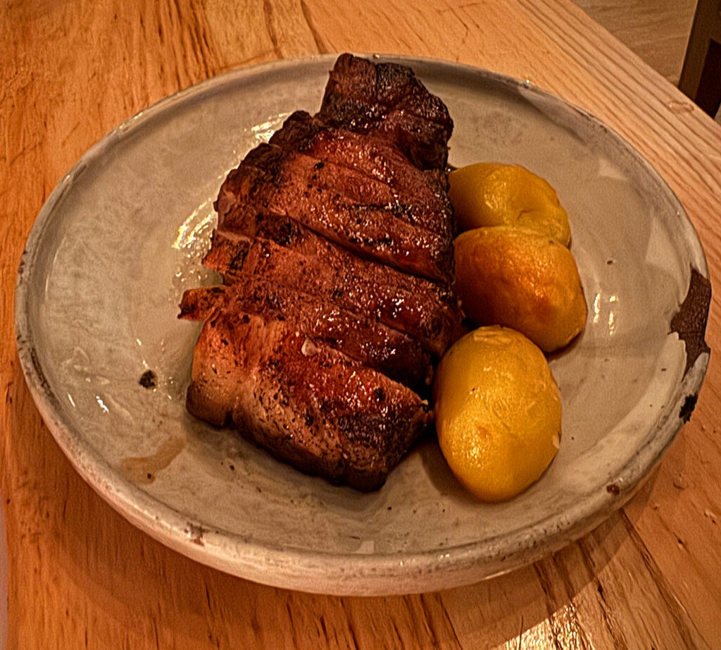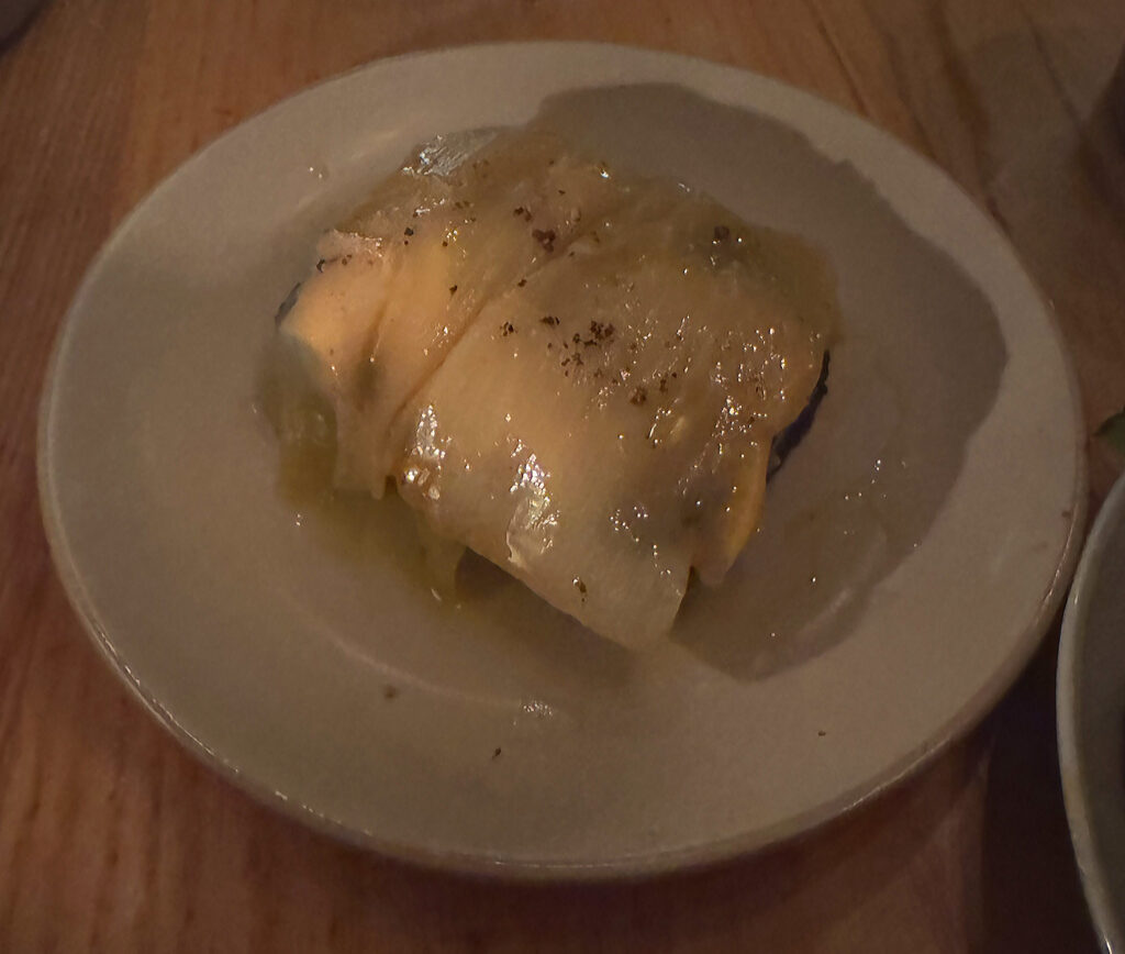 In practice, I find that many of the center pieces of the loin are fairly chewy: displaying some supporting juiciness but, in turn, occasional streaks of connective tissue as well. That said, the cap running along the side is well rendered, and the best pieces of the cut (located at either end) blend flesh and melty fat with an ample imprint of salt. The potatoes, for what they’re worth, are rich and creamy (if not totally distinctive). But it’s really the pig’s foot tare that lets the recipe down. This accompaniment (traditionally a thickened soy sauce) is lightly drizzled over the pork and offers a mild degree of sweetness. It also, admittedly, helps to tease out some of the smokiness provided by the coals. However, despite drawing flavor from the animal’s trotters, the tare lacks the kind of palate presence or concentration I would expect to carry the dish. It offers but a whisper (rather than a roar) and, ultimately, leaves me searching for something more. What’s left is a plate of slightly overcooked meat and potatoes that, while pleasant enough, falls short of the standard this restaurant so often sets.