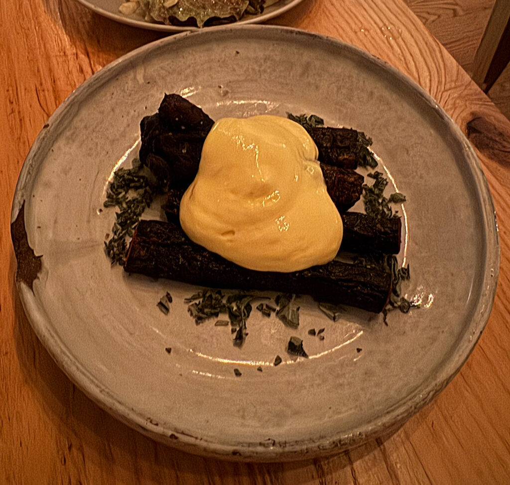By cooking the salsify in brown butter then dressing it simply with a horseradish espuma and plenty of sage, the kitchen looks to straightforwardly emphasize the starring ingredient’s savory quality. Texturally, the long segments of vegetable display a crisp, warm, and creamy consistency not unlike roasted carrots. The resulting flavor is markedly earthy, yet, with the help of a sharp line of acidity, a perfect application of salt, and some woodsy intrigue, it reveals sweet and nutty undertones that are highly appealing. Ultimately, this recipe (which screams to be paired with a light red wine) is skillfully executed and wholly rewarding. It wildly succeeds in introducing the audience to a root they might never even think to crave.
