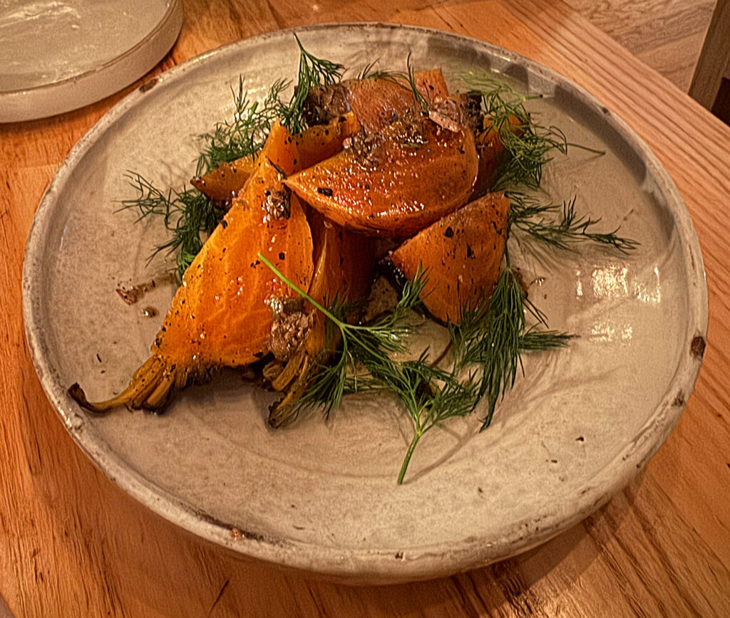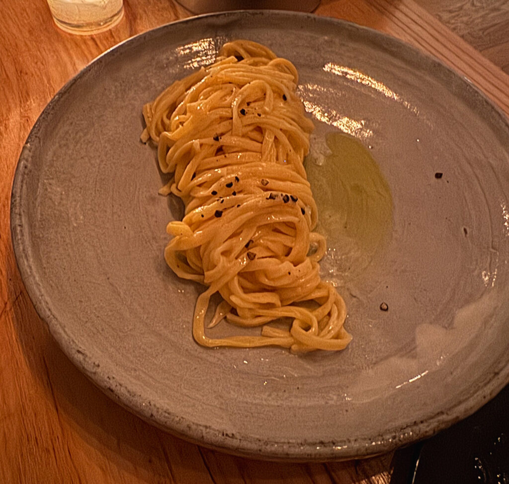 The evening’s pasta course comes courtesy of the “Spaghetti alla Chitarra” ($24): a recipe I have encountered at the restaurant before and, on this occasion, comprises the titular square noodles tossed in Tulip Tree Creamery’s Trllium, some olive oil, then flavored with winter garlic and cracked black peppercorn. The mouthfeel of the spaghetti, spooled so enticingly, marries a sense of weight and subtle chew with a soft, creamy finish. Yes, the noodles are skillfully rendered, and their ultimate expression (combining predominant notes of fresh butter with just a hint of sharpness) ensures that the texture remains the star. Indeed, while I am tempted to wish for greater intensity here, a light touch—in a city brimming with meaty red sauce—is perhaps the point. This composition threads the needle of interesting yet enjoyable quite well.