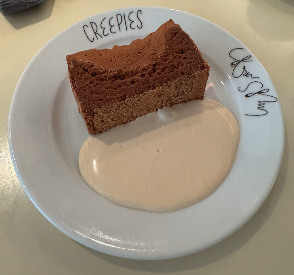 Structurally, the cake is composed of a dense, flourless base with a reservoir of cool, firm mousse running along the top and dipping down through the middle. On the palate, the former layer provides a rich, fudgy sensation while the latter (tempered by the temperature of one’s mouth) turns moist and melty. The sum effect is something like a frosted brownie, and the silky coffee cream (pooled to the side of the plate) serves to further moisten the crumb. When it comes to flavor, I am pleased to find that the expression of chocolate is medium and milky rather than delving into the bitter depths of a darker blend. The roasted character of the coffee, too, is carefully integrated: providing supporting complexity without in any way detracting from the enjoyment at hand. Truly, this is about as precise and crowd-pleasing as chocolate desserts get. The cake—in both intention and execution—is a triumph.