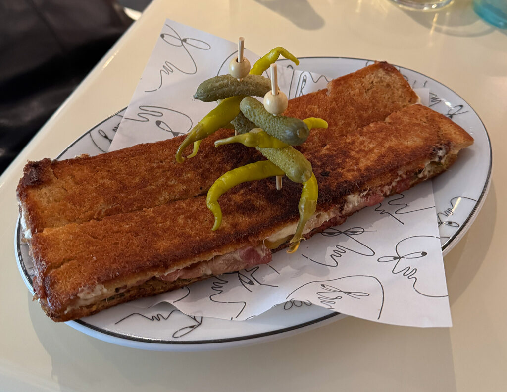 Relative to the preceding item, a “Croque Monsieur with Ham & Mornay” ($22)—on which I decided to also “add egg jam” ($4)—carries much higher expectations. Indeed, this is not a recipe that the kitchen is trying to scale back or repackage (however skillfully). Rather, it is one they are looking to hone to the highest degree of decadence (while also giving diners the opportunity to double down on that effect via the supplement).