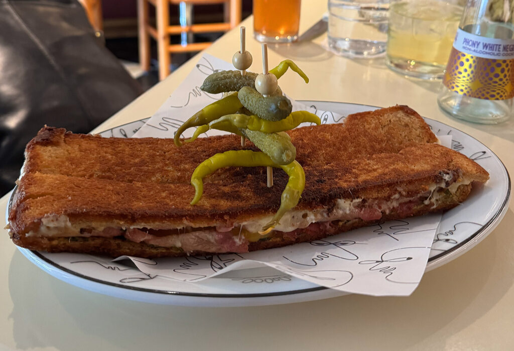 Structurally, the sandwich is a little tricky to handle without one of its ends flopping over. The kitchen’s intention may be for guests to further divide the portion; however, I can vouch that it’s entirely possible to eat the dish (as presented) without making a mess. On entry, the croque monsieur displays a lovely, crisp rigidity that seamlessly yields to a doubly gooey interior. Certainly, the ham here is perceptible, yet I’m impressed by the fact that no stringiness or errant fat detracts from the larger textural effect. When it comes to flavor, I find that the dish is driven primarily by a nutty note of cheese. The meat is not all that pronounced (though I appreciate the overall level of salt is kept in check), and the egg yolk generally serves to further enrich the mornay. The pickles and peppers, when incorporated, offer a key contrast. Nonetheless, while I think this preparation is amply seasoned, I almost want something to dip it in (or for the tangy toppers to be incorporated under the bread) in order for this sandwich to really soar. Still, this remains a nice example of the form.