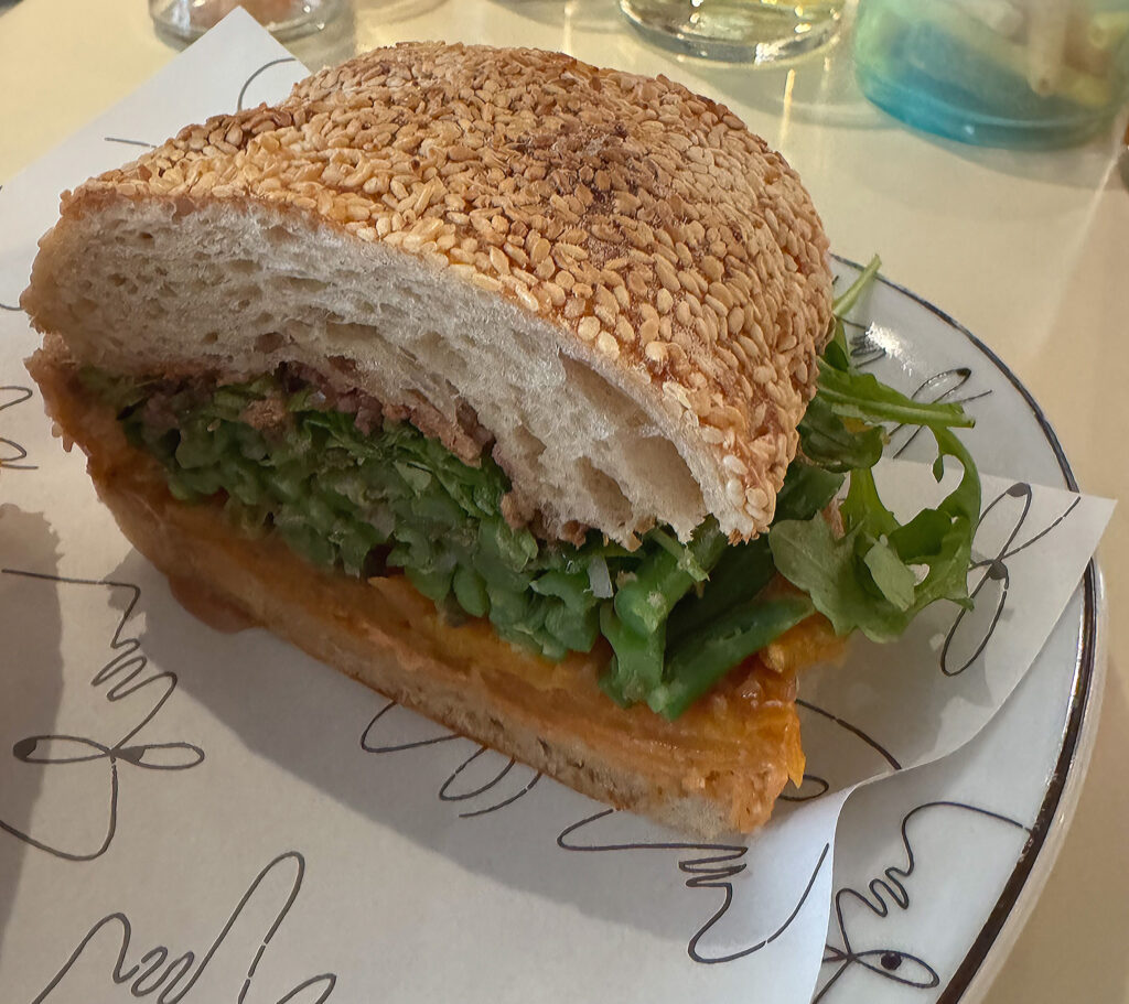Moving on to the entrées, I find a total of five new dishes to sink my teeth into. The first of these is a “Niçoise Sandwich with Smoked Beet” ($20) that, interestingly enough, also reinterprets one of the French bistro’s classic salads. Here, not only is the headlining tuna (or anchovy) totally excised, but the whole thing is stacked within a sesame roll. There’s the base layer of thinly sliced beet, then an application of tomatoey dressing, followed by an absolute thicket of trimmed green beans, some arugula, and a top layer of olive tapenade.