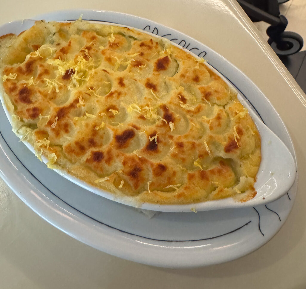 Arriving next, the “Sturgeon Pie with Duchess Potatoes” ($24) stands as the most substantial, soothing (for the present cold weather) dish on offer. And, despite the clear French influence guiding Creepies’s cooking, the resulting serving (which one might place in the hachis Parmentier tradition) feels something like an amalgam of shepherd’s pie and chicken pot pie. On top, there’s a layer of eggy, faintly crisped potato purée (garnished with lemon zest) and, below, waits a molten layer of cubed sturgeon meat moistened with an allium-laced gravy.