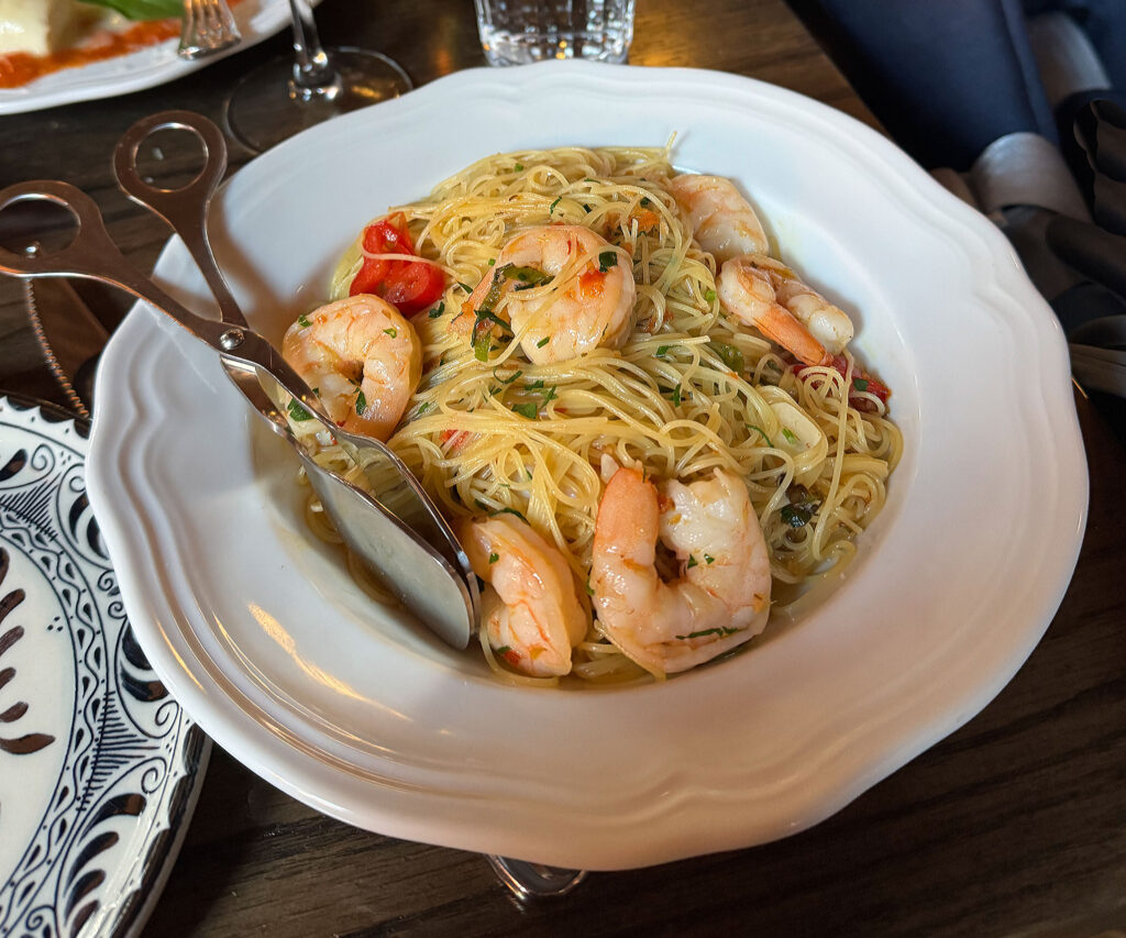 Lastly, the “Aglio e Olio Peperoncino” ($28) comes highly recommended by the servers, and, as before, they do not err in their guidance. The pasta of choice here (though not actually stated on the menu) is angel hair, and the titular blend of garlic, olive oil, and chili pepper (cherry pepper to be exact) come joined by a generous handful of shrimp. The result—soft noodles, plump shrimp, a pronounced note of garlic, and a slight sharpness on the finish—is simple yet satisfying. Better yet, I do not detect any of the same saltiness that blemished the preceding plates. While this pasta might not form the most obvious choice (compared to the archetypal red sauce), it ranks as the one dish in this category I would order again without hesitation.