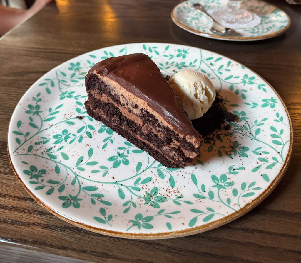 The ”Chocolate Cake ($16), by comparison, looks to embrace decadence wholeheartedly: blending a buttermilk crumb with a mousse filling, a thick frosting, and a counterbalancing scoop of vanilla gelato. The result delivers all the concentrated, milky tones one desires from this kind of dessert. However, the cake itself lacks any of the fluffiness or moistness that would actually help to distinguish and enhance its richer elements. Indeed, the dish eats like a dense slab of chocolate, and it’s only with the addition of the gelato that some of its depth of flavor comes out. Ultimately, this item may be tough for some guests to finish, but it also undeniably scratches its target itch.