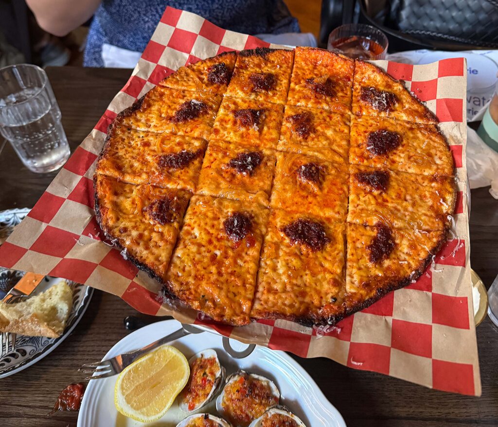 Next come the “Sesame Focaccia,” “Baked Clams Casino,” “Hamachi Crudo Diavolo,” “Meatballs,” “Spicy Vodka & Nduja Pizza,” “Chicken Parmesan,” “Eggplant Parmesan,” “Tiramisu,” and “Chocolate Cake”—merely good (maybe just average) items that fell short when it came to texture or flavor. None of these bites faltered in more than one dimension, so there was still pleasure to be had (and, indeed, they could all easily be fixed with a little more tweaking).