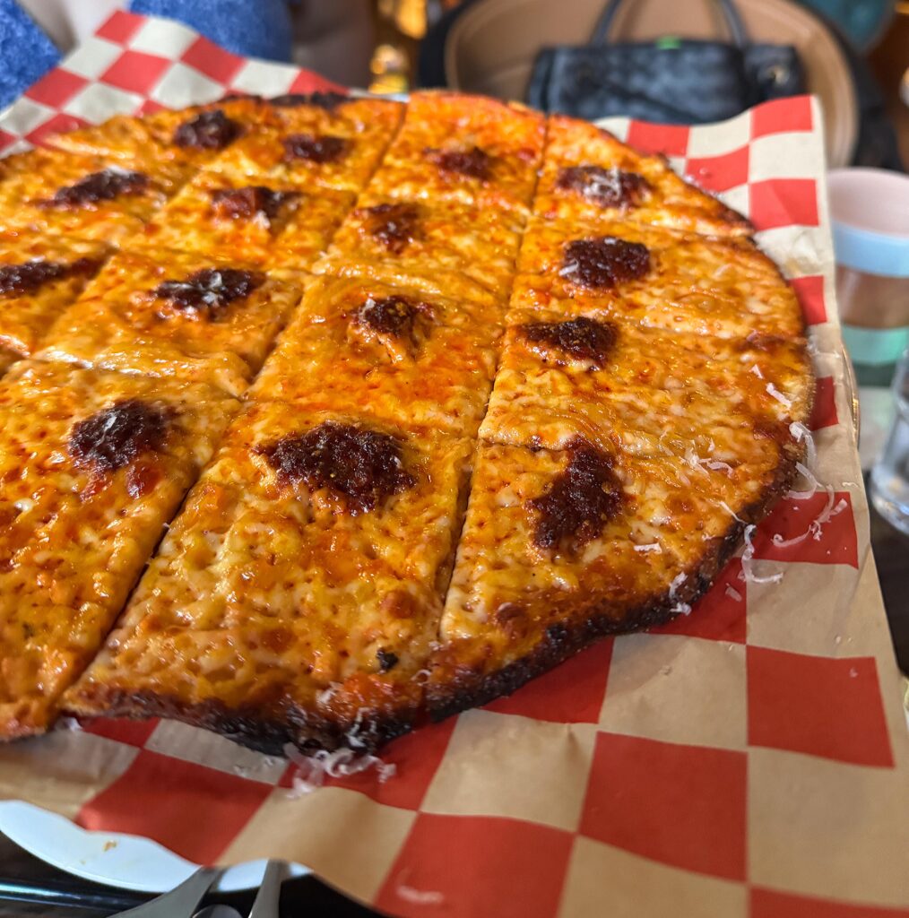 When I spot the “Spicy Vodka & Nduja Pizza” ($25), I get even more excited: this is a sauce, itself so totemically Italian-American, that (beyond its use with pasta) typically only appears as part of certain coalfired forms. I’ve rarely seen it make its way onto a tavern-style pie, where it can nudge the flavor profile toward increased heat and creaminess.