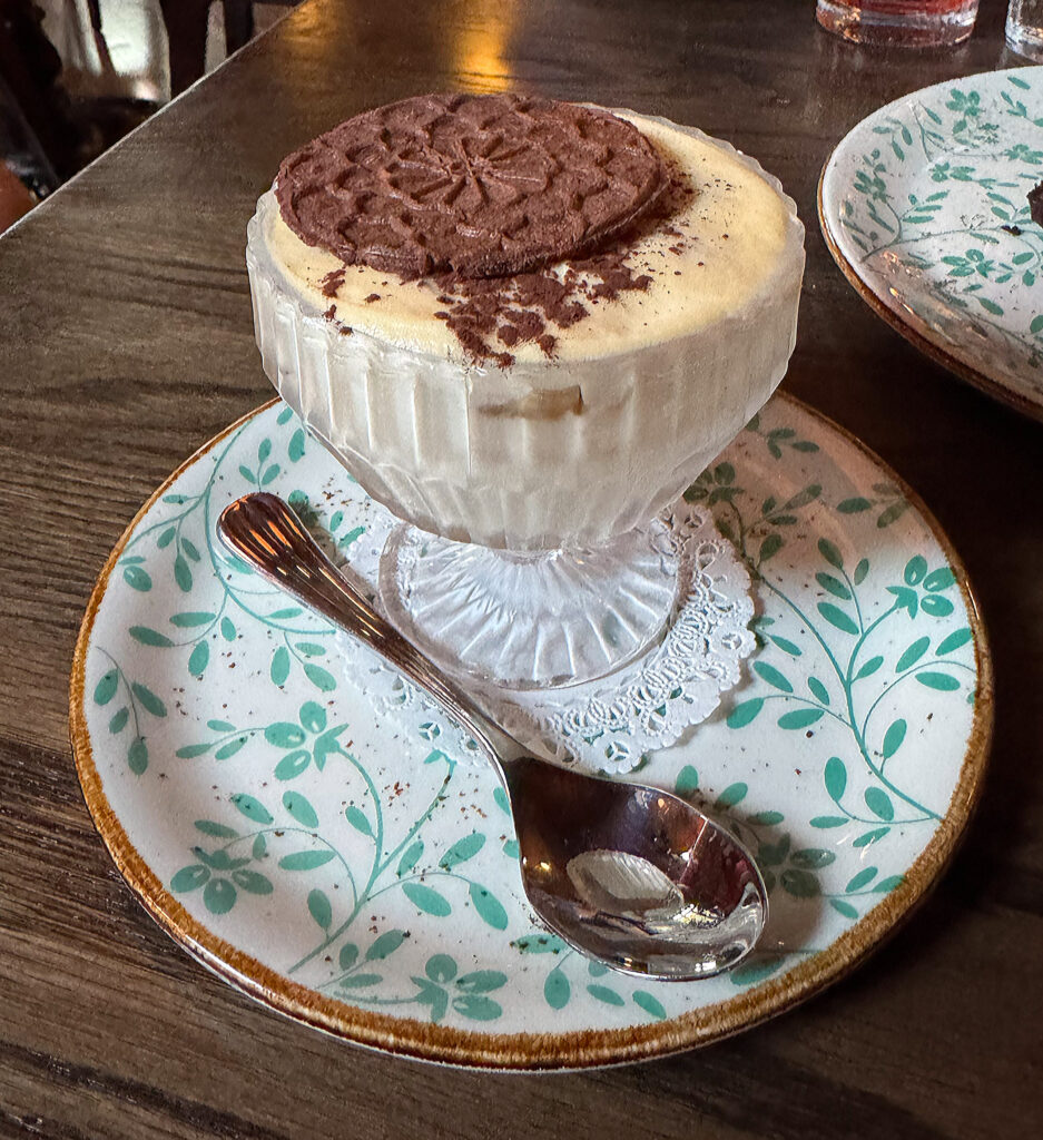 A “Tiramisu” ($14), served in a sundae bowl, combines the familiar espresso-soaked ladyfingers, mascarpone cream, and cocoa powder with a crowning wafer cookie. It’s a welcome touch, but the dish’s texture is thicker and richer than what I prefer. Yes, it eats more like a pudding than an elegant, whipped assemblage. However, the resulting flavor—so perfectly bittersweet—rings true. Overall, this makes for a good (if decadent) example of the form.