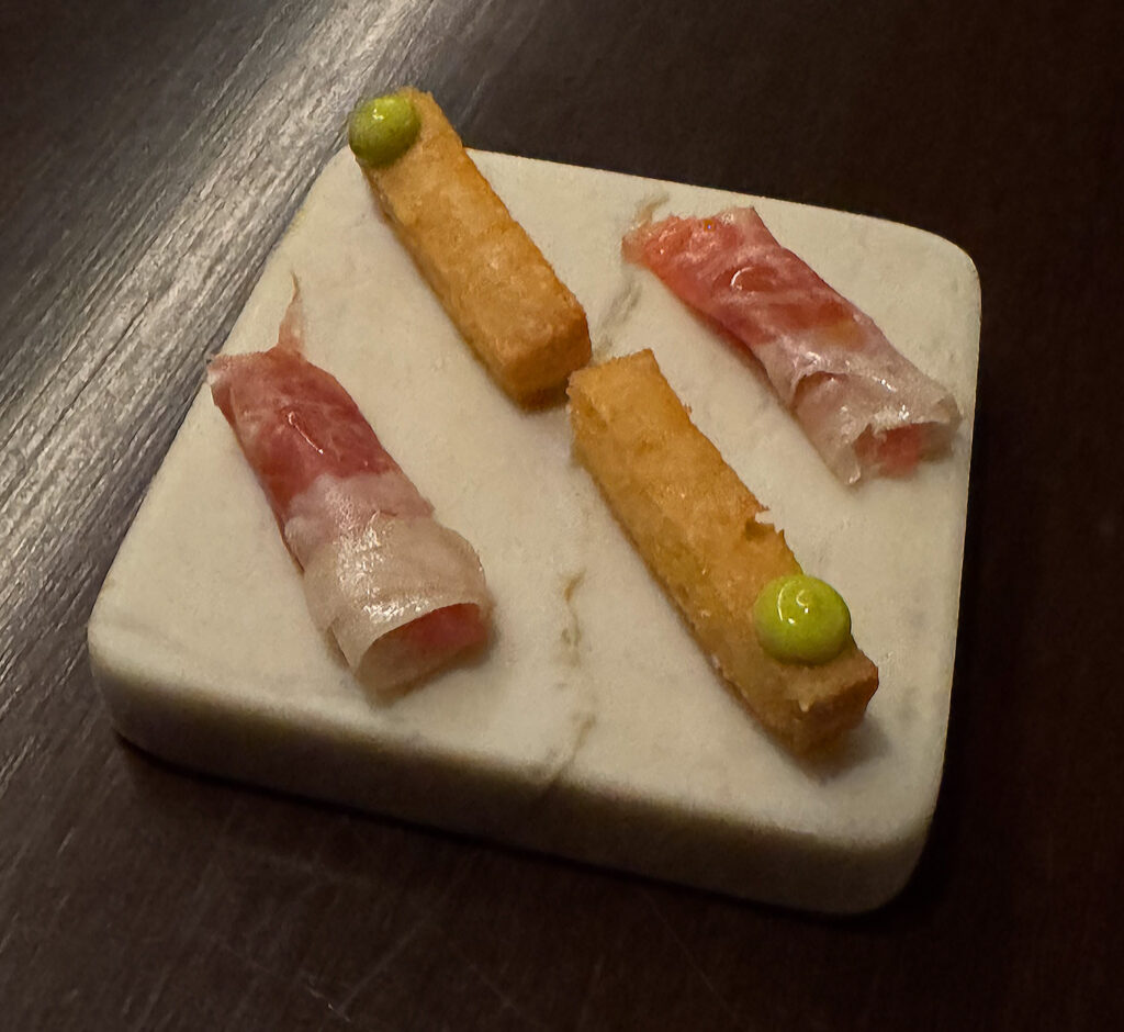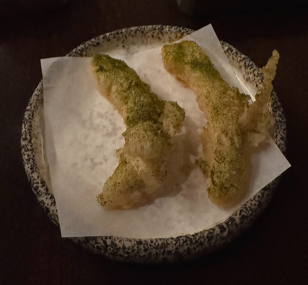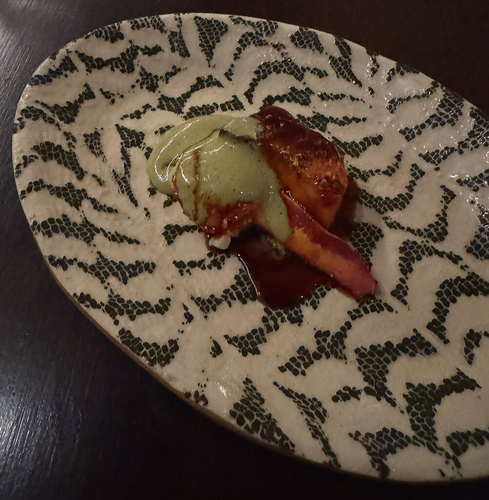 Last of all, one finds the “Foie Panisse”—a chickpea flour fry that is cooked in foie gras fat and finished (on one end) with a dab of allium. Though simple enough, this offering is executed to perfection: delivering a satisfying crunch, a perfect dose of salt, and a surprisingly savory finish. I probably (like the tempura) should have eaten this one earlier, yet its consistency held up nicely all things considered.