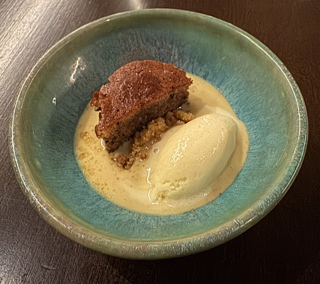 Texturally, the crumb of the starring element is remarkably moist and smooth. It grows richer and softer as it soaks up the accompanying liquid (including the well-tempered ice cream), revealing a flavor that spans deep, earthy, toasty, and roasted root vegetable notes before settling on a nutty, fruit-kissed concentration of sweetness that displays shocking length. Yes, the ingredients here achieve total cohesiveness and deliver a degree of pleasure that stands, perhaps, as the kitchen’s biggest hit of the night.