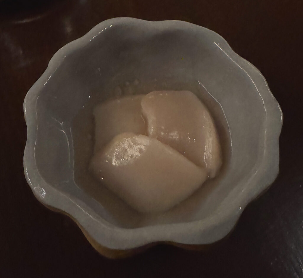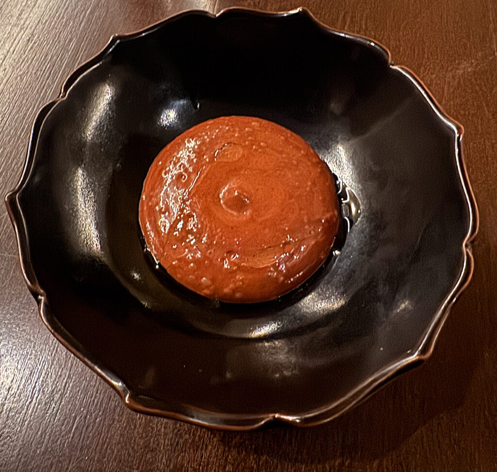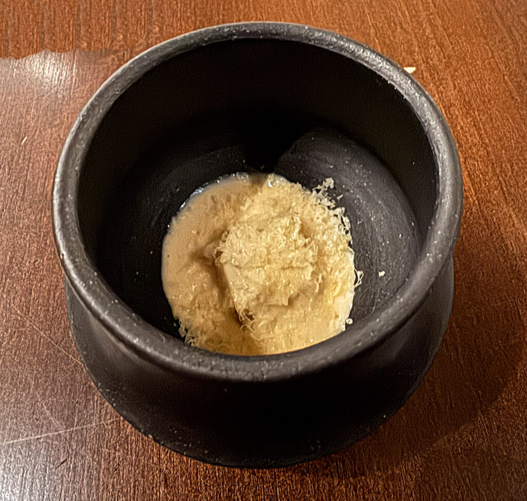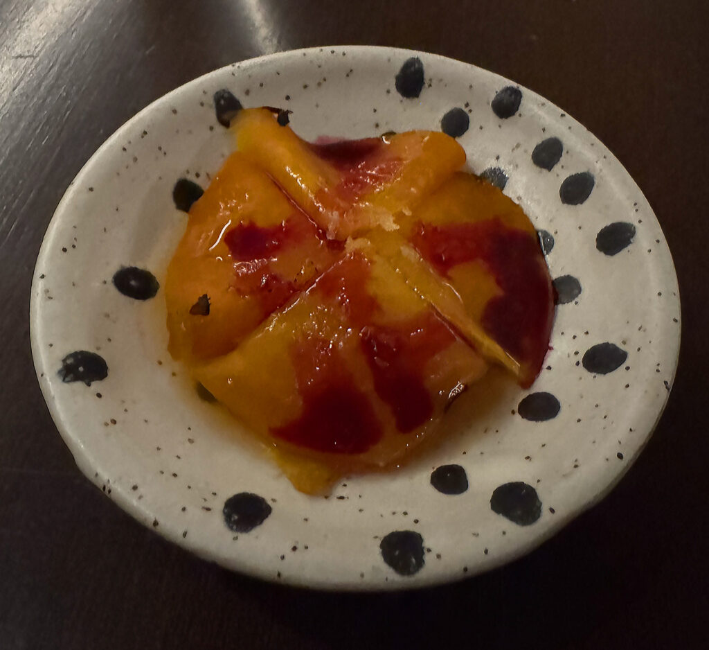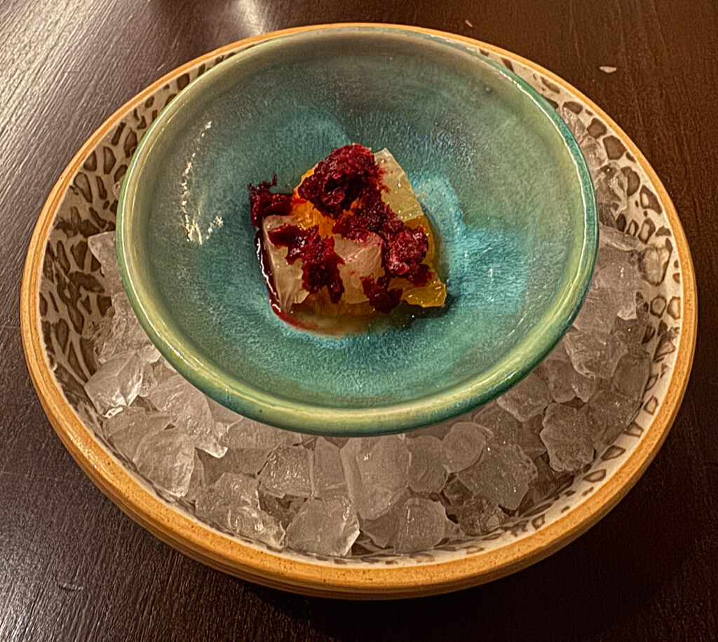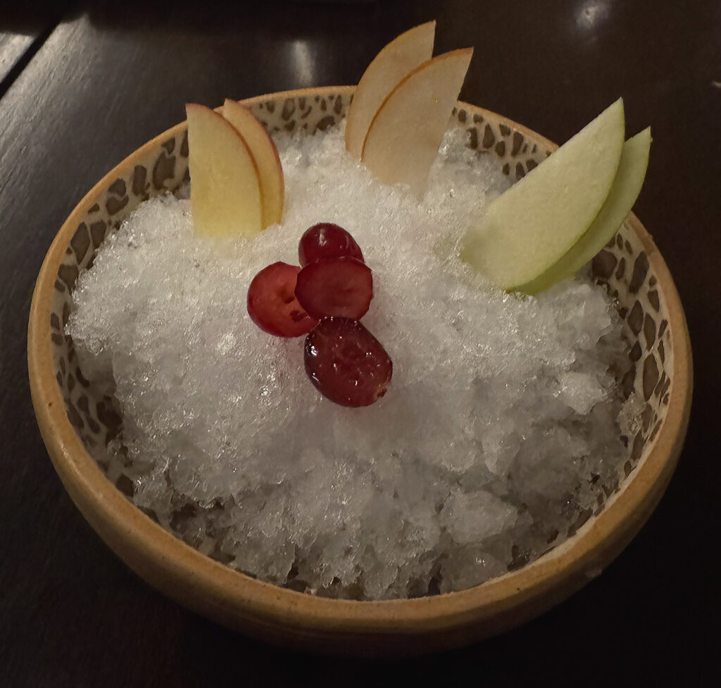 Feld’s penultimate offering is the “Fresh Fruit on Ice”—a presentation (however charming) whose actual quality has been murky in the past. On this occasion, the selected cranberries, slices of Korean pear, and apple segments each deliver crisp, freshly sweet sensations that reconnect one’s palate (at this late stage) to simple, natural flavors.
