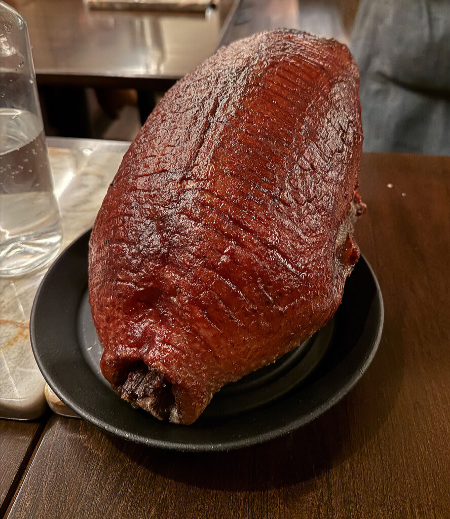The “34-Day Au Bon Canard Muscovy Duck” that arrives next is undoubtedly the main event: one that not only showcases a relatively precious product but that represents a rare departure from the aged pork preparations the restaurant has long favored. Visually, the meat marries its attractive, craggy exterior (noted earlier) with a subcutaneous layer of rendered fat and a pinkish (almost tending toward red) base of blushing flesh. Finished with a sprinkle of salt, the sizable portion is paired with a sourdough rye jus as well as reductions of pomegranate and passion fruit.