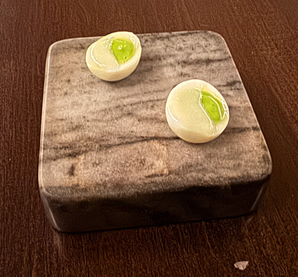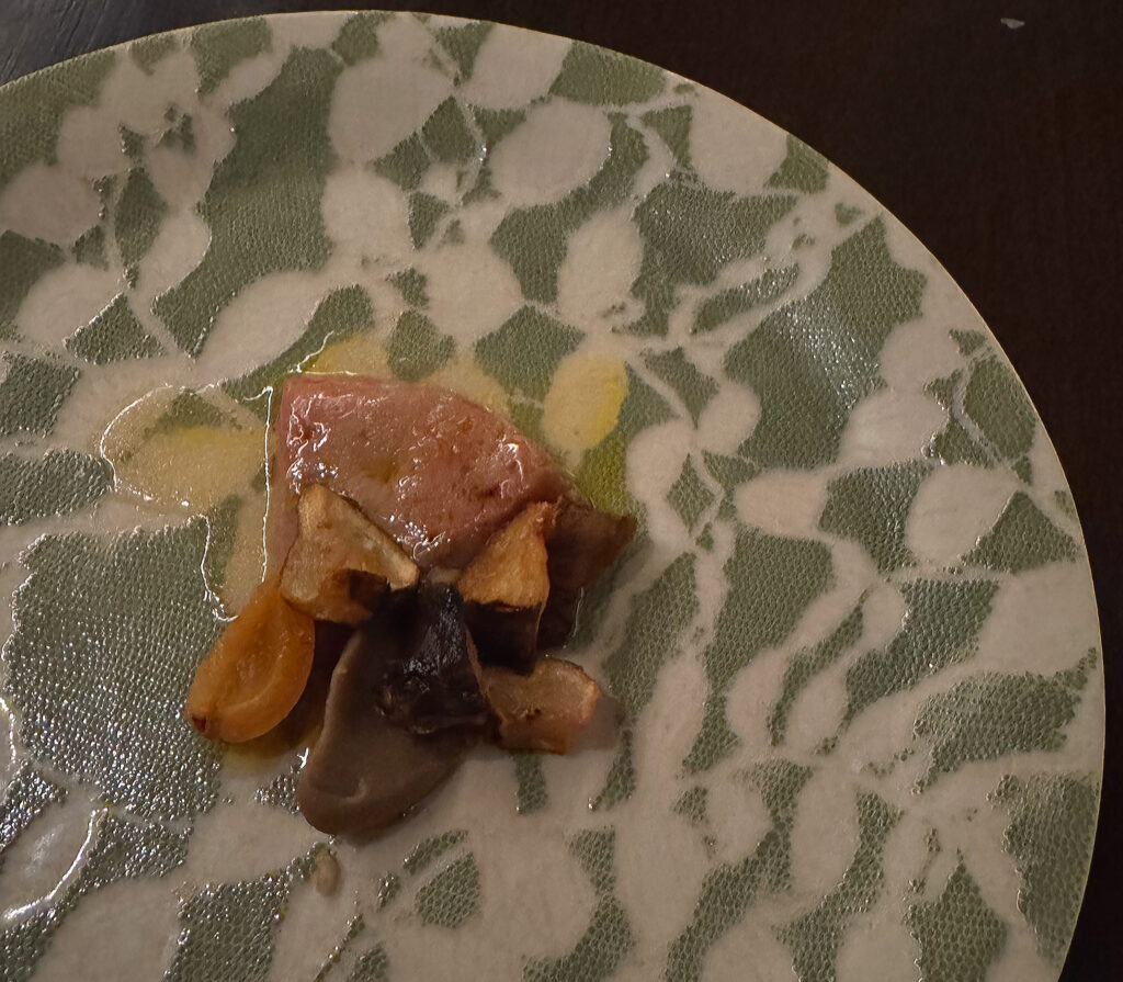 A serving of “Cured Scallop” (that is, cured using Benton’s ham) is paired with green pear vinaigrette and horseradish oil. On the palate, it combines a beautifully soft mouthfeel with uplifting tang, attractive sweetness, and just enough salt. This makes for one of the highlights of the sequence.