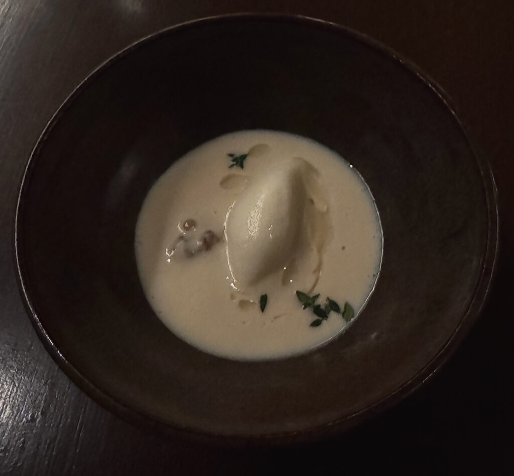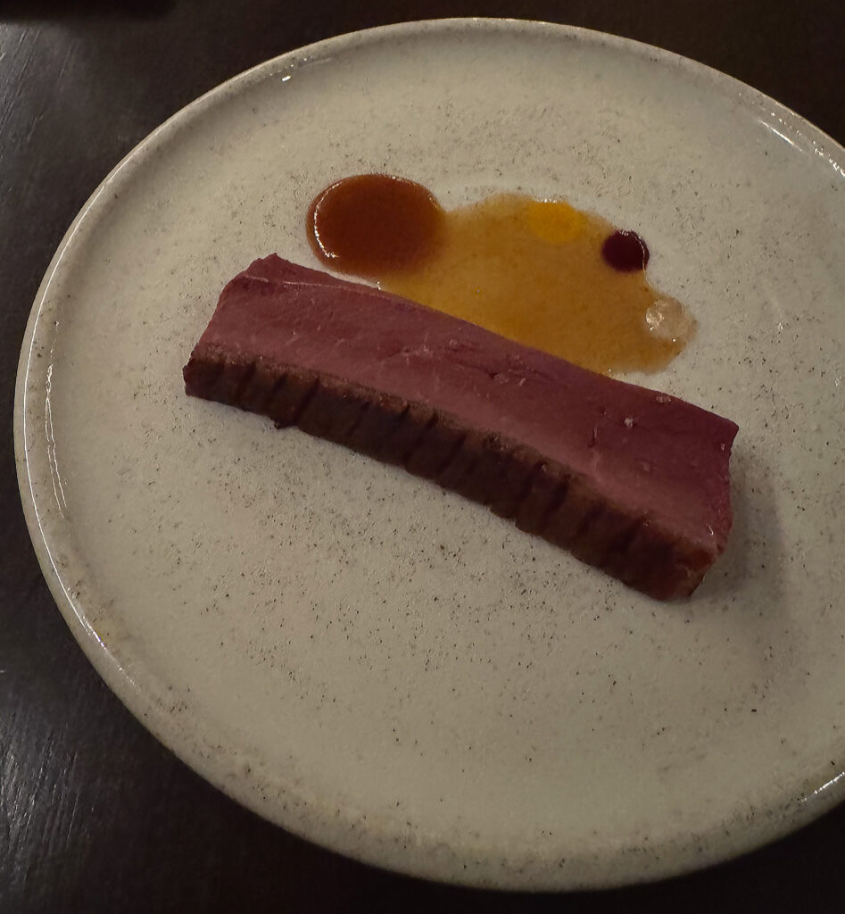 A course titled “Gilfeather Rutabega—Chestnut” continues this trend. The heirloom variety named here (technically a cross between the titular vegetable and a turnip) dates back to the early 19th century. Here, it comes butter roasted and portioned into four small slices. They come served in a broth made from dashi, Benton’s bacon, toasted rice, and the starring chestnut: lending roasted, earthy, and savory depth to an otherwise sweet, subtly crunchy expression of rutabaga. The combined sensation is deeply comforting, and I am again left charmed by the kitchen’s way of elevating overlooked produce.