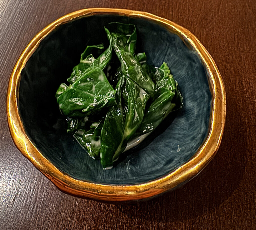 Thankfully, the “Winter Spinach—Goat’s Butter” that arrives next represents an immediate turnaround. Beyond that, there’s really little to add in terms of detail when it comes to the recipe. The spinach here has been over-wintered and simply thrown on the grill. The goat’s butter, in turn, is used to make a classic beurre blanc. This yields mouthfuls that are crunchy, creamy, and building in their sweetness. The overall effect is so satisfying, and this dish epitomizes the kind of minimalist (but memorably pleasing) vegetable cookery Feld is perfectly positioned to present given its format.