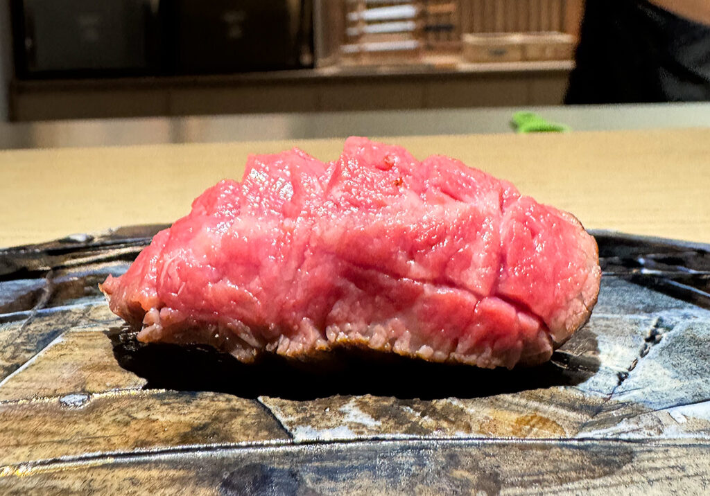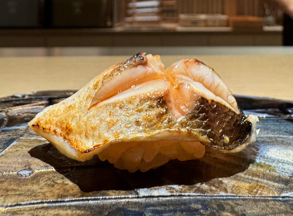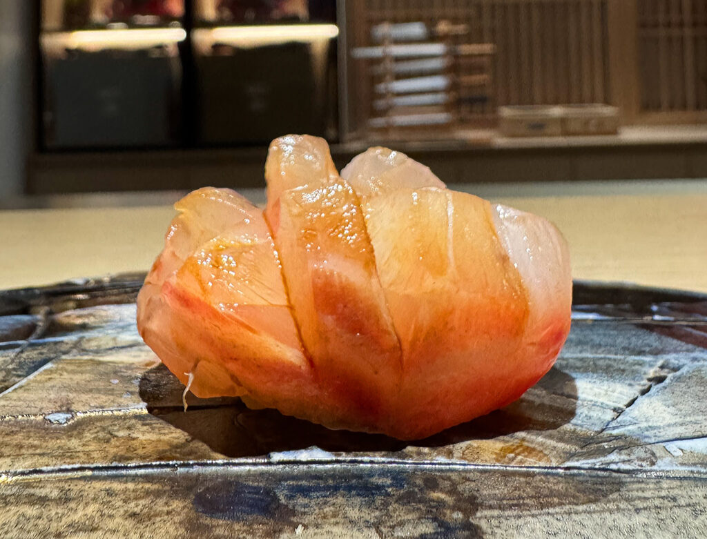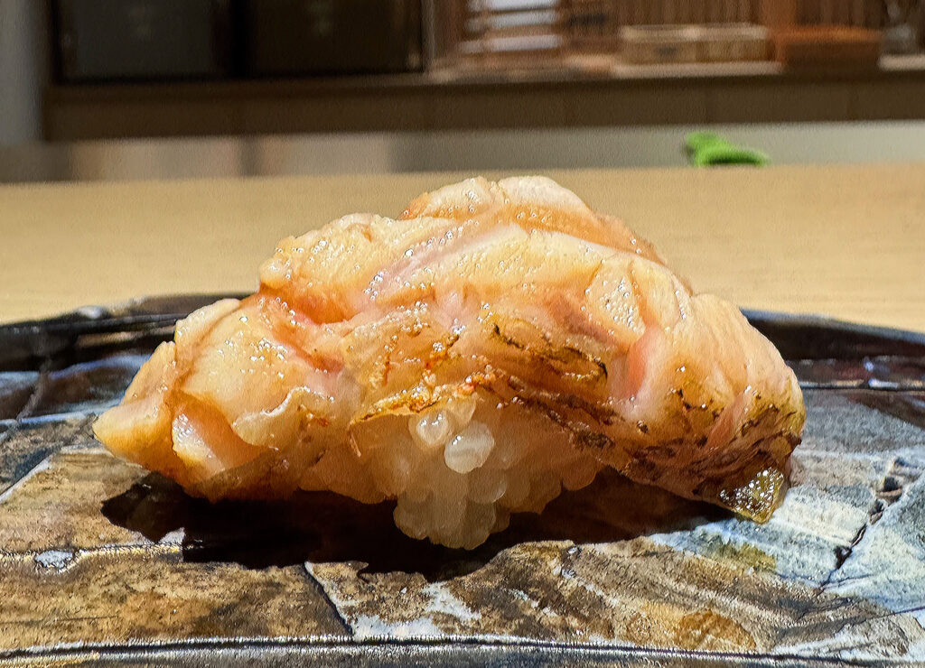 With the arrival of the “Madai” (or red seabream), things start to get serious. The fish’s scoring is far more intricate, and I even see some grains of rice peeking out underneath. This piece looks every bit like one that Phan himself would serve, and what I taste corroborates that impression. Texturally, the madai boasts more firmness than the preceding bites—a quality that feels weighty and satisfying in this context. That said, the flesh proves plenty tender with further mastication, imparting a flavor (laced with lemon zest) that is remarkably clean and resoundingly sweet. For the first time tonight, Villa’s work matches that of the master. Bravo!