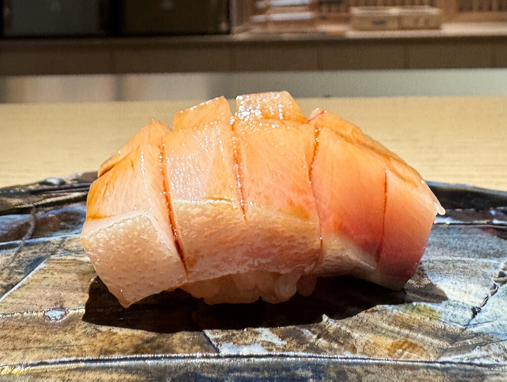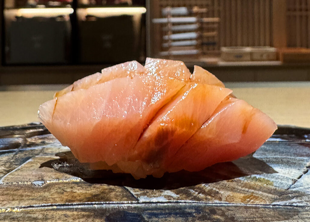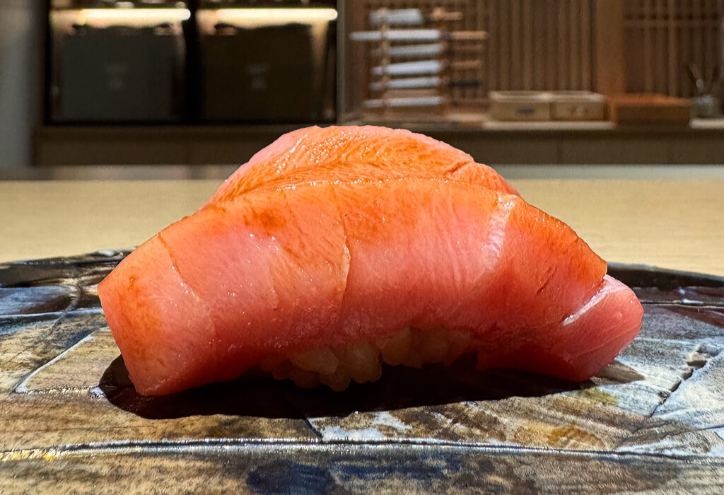 Thankfully, the “Ōtoro” (i.e., the fattiest cut from the same belly) displays that extra bit of intensity I am looking for tonight—ironically so when one considers this piece is typically more of a textural thrill than anything. Visually, the bite certainly looks true to type: displaying pinkish (tending toward white) flesh with a fine lattice of marbling woven throughout. Scoring proceeds horizontally, yielding a gentle curve over the obscured mound of rice.