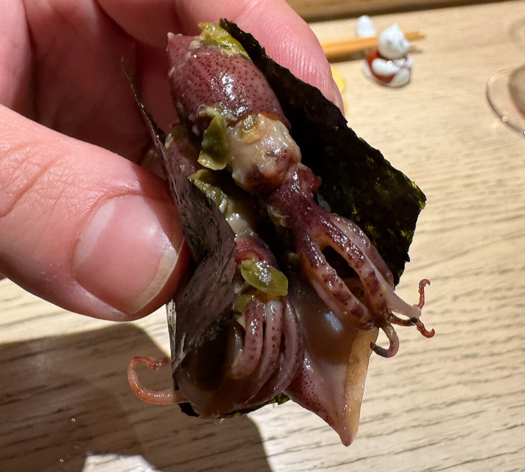 The third and final valley of the night comes from the “Hotaru Ika”—a presentation of firefly squid (a seasonal delicacy) that Phan himself reserves for the small plates. In something of a repeat of the Hawaiian shrimp, the chef adapts the recipe (characterized by its caper relish) for use in a hand roll. At its best—that is, eaten one by one with chopsticks—the squid blends warmth and plumpness with an anchovy-like flavor. Tonight, the ingredient strikes me as unpleasantly chewy and rather murky (though not offensive) in taste. Ultimately, I get none of the savory intensity I expect from such a rare, cherished item. That said, Phan’s own preparations of the hotaru ika can sometimes fall flat, and I’ll chalk this one up (at least in part) to the cephalopod’s own caprices.
