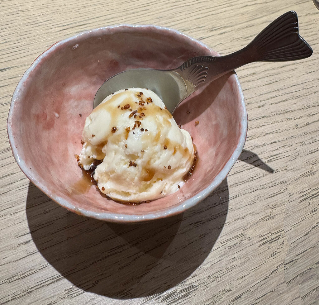 Roughly two hours later (from the first piece of salmon to the arrival of the ice cream), the omakase reaches its conclusion. The meal’s 24 total bites proceeded at a pace that puts the Kyōten flagship (where the experience typically pushes three hours) to shame. And, while Villa’s work does not quite match his mentor’s in aspiration or refinement, the chef honors the counter’s philosophy: ensuring his guests leave full and happy and open to the full range of possibilities that sushi—divorced from pomp yet crafted with a distinct perspective—can provide.