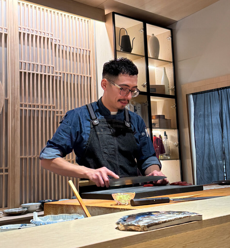 Left to man the counter on his own, Villa’s experience from Next Door serves him well. The chef’s manner of interaction is easygoing and conversational. He smoothly traverses the space and goes through the motions of slicing, forming, and seasoning each fish with a reassuring confidence. Bites are described with much of the same detail that Phan himself provides (understandably so since many of the ingredients served tonight are from the sister concept’s menu). There are even tinges of the kind of banter and irreverence that make Kyōten’s hospitality so singular within the genre.