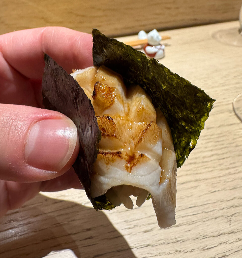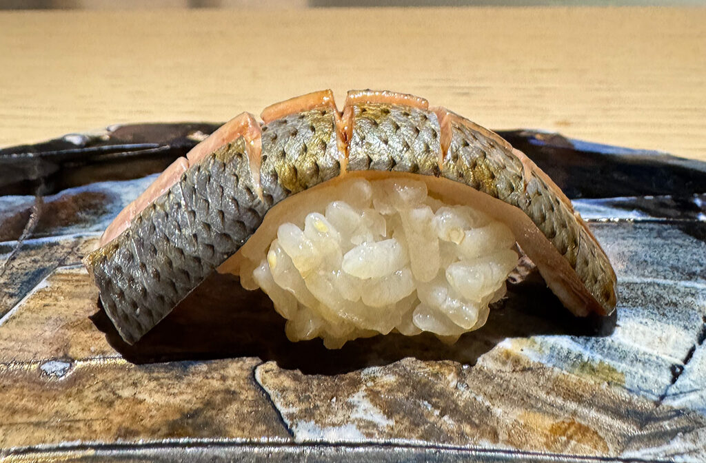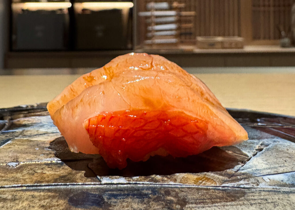 “Shima Aji” (also known as the striped jack) ranks as one of those bites that steals the show. Indeed, this is one of my all-time favorite fish, yet wild-caught examples are so rare that I barely ever see Phan serve it. Visually, the piece—with its ruffled scoring, traces of silvery skin, and elegant curvature (exposing the mound of rice below)—is one of the evening’s most attractive, and the combination of a firm (almost crunchy) first impression with an overarching butteriness is divine. Charged with a degree of savory intensity that transcends anything served up until this point (one that smoothly integrates notes of wasabi, vinegar, and soy sauce into a cohesive whole), the shima aji blows me away. Tonight, it stands as the one item I wish I got to taste more often at the flagship.