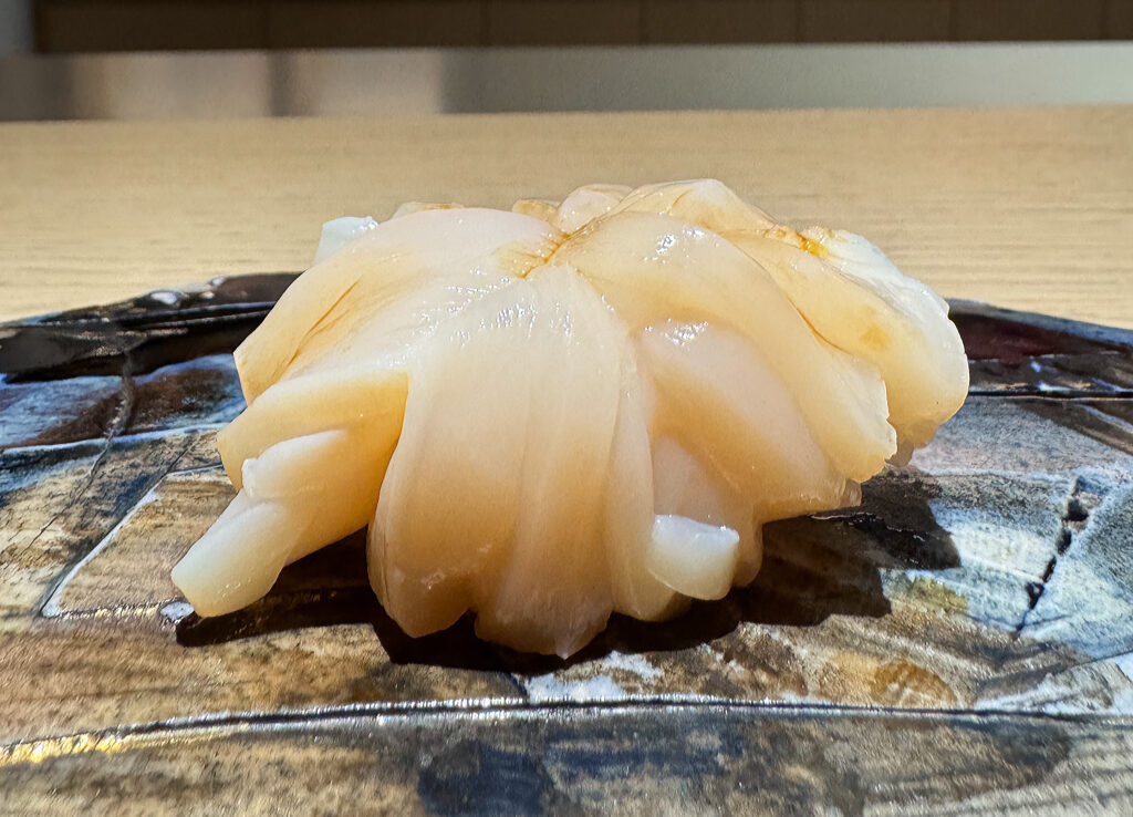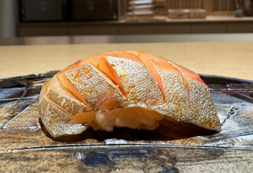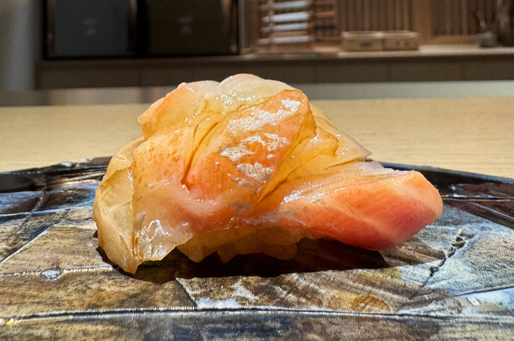 The “Barracuda” carries no such expectations, and, to be honest, I cannot recall ever being served this fish (also called kamasu) at an omakase. The resulting piece, which benefits from the evening’s first use of the torch, boasts crisped (lightly charred) strips of skin that surround a central point of scoring. With visible grains of rice underneath, this bite’s visual appeal ranks among the meal’s most “Kyōten-like.” Texturally, the barracuda displays an admirable richness and flakiness that reads as meaty. The flavor, too, possesses a nice inherent sweetness that is complicated by a hint of bitterness (perhaps unintended) on the finish. Overall, this makes for a fish that, while not among the menu’s most memorable, successfully provides a warmer, weightier expression at this early stage.