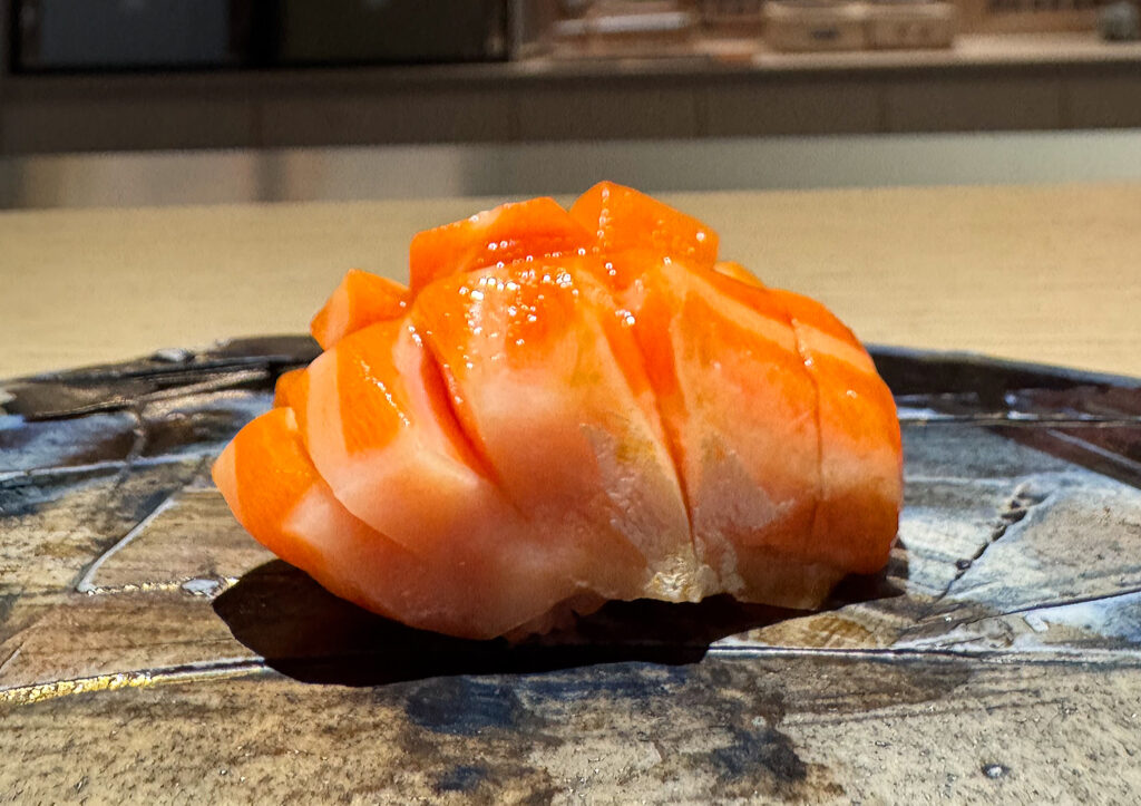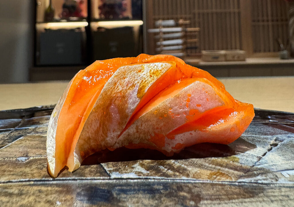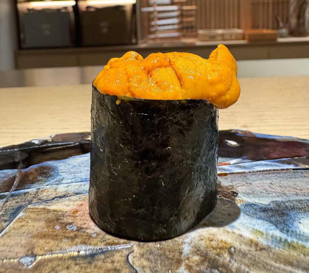 On the palate, the resulting bite blends the clean crispness of the seaweed wrapper (always one of the restaurant’s strengths) with the creamy, moistening mouthfeel of the uni on rice. Of course, the sea urchin’s flavor is always determinative, and the present example (free of any jarring irony quality) beautifully blends semi-sweet and oceanic notes across a lengthy finish. Overall, this makes for another piece that lives up to Phan’s usual standard and, in effect, justifies the premium one might pay for this extended omakase. Well done!