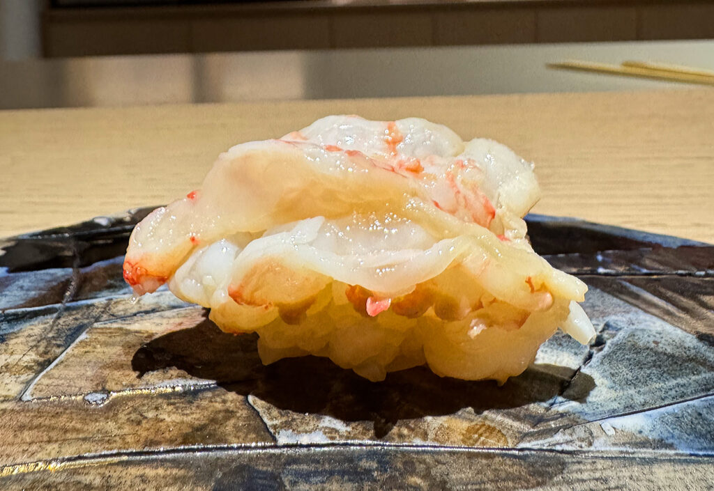After a long series of peaks, it’s inevitable that such a lengthy omakase will have its valleys too. The first of these comes in the form of the “Hawaiian Shrimp” (also called aka ebi), an ingredient that has kicked off many Kyōten meals during the latter half of 2025 and into 2026. Phan presents the shellfish as a kind of “ceviche” (made from dashi and lemon juice), and Villa transforms the same recipe into a piece of nigiri. The resulting bite is plump on entry but tends toward crispness rather than butteriness. The accompanying flavor, too, starts of tangy while never really becoming sweet. In fact, something tastes off—almost fishy—and, despite seeming fine on paper, this item lands noticeably below everything else served tonight.