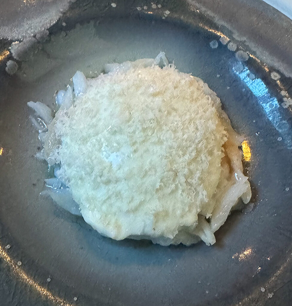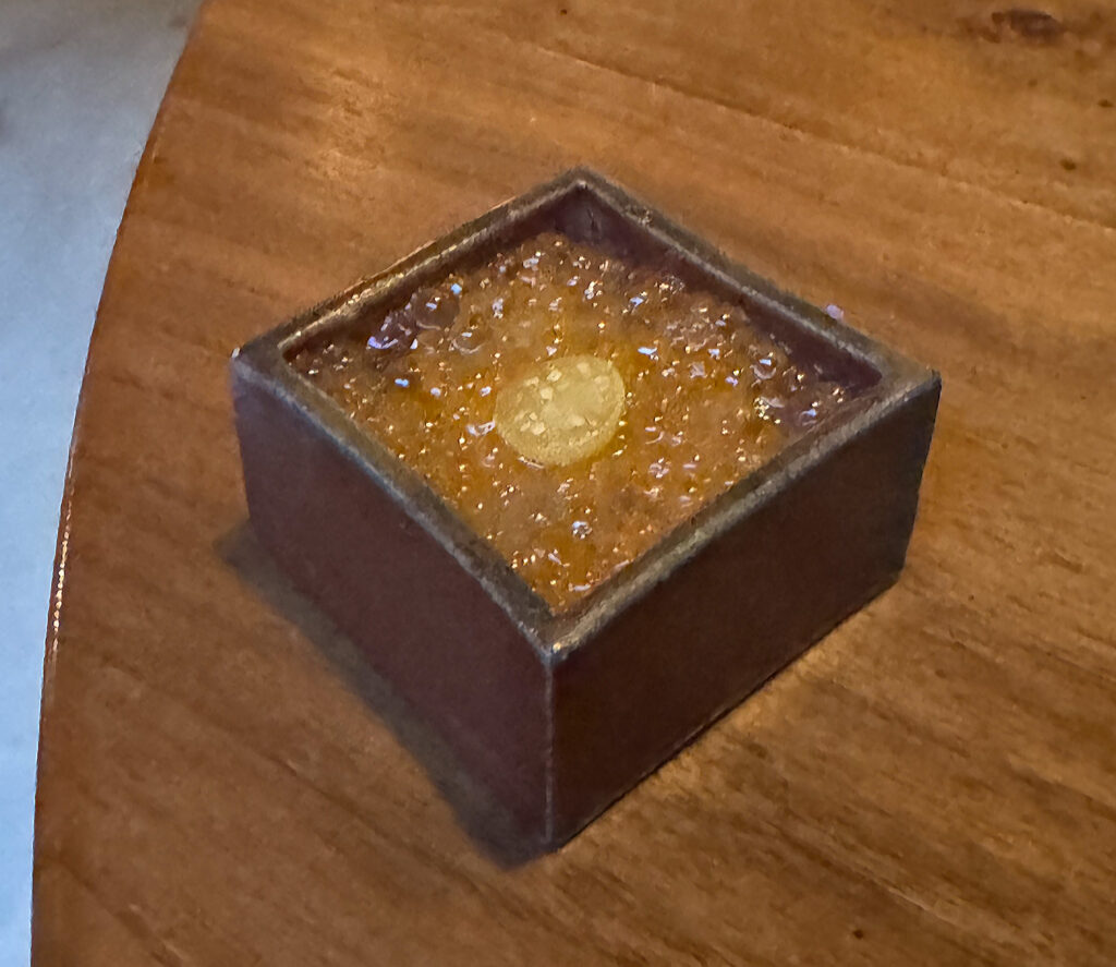 Texturally, the tartelette blends a gossamer (but appropriately brittle) base layer with moist, melting crab and subtle pops of seed and citrus. The sum effect feels totally cohesive, and the resulting flavor—sweet, nutty, faintly earthy/briny, and enlivening in its tanginess—aims straight at pleasure. It also matches the notes of the “Amazake” beautifully, making for a seamless transition that also cleanses the tongue for what comes next.
