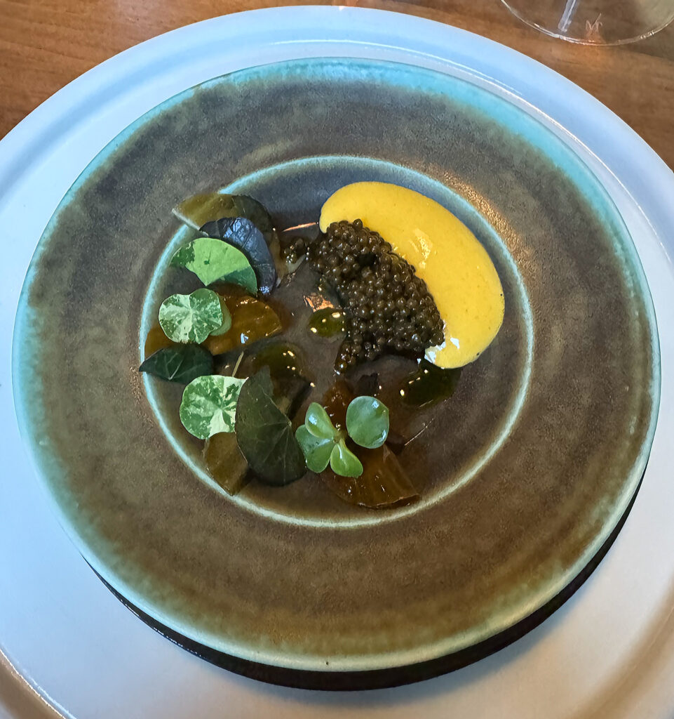 Arriving next, the “Caviar & Pumpkin Seed” represents the latest version of what has, throughout 2025, established itself as Smyth’s latest and greatest method of serving the prized sturgeon roe. The recipe presents something of a clean break from the “Hot & Cold Kaluga Caviar” and “Caviar & Almond” compositions that have predominantly featured during the period from 2021 to 2024. Those preparations favored sticking a healthy scoop of the eggs to the side of a bowl featuring the same kind of nut oils and nut milk (along with preserved nuts, fudge butter, and housemade nocino) just seen in the “Lobster & Uni.”