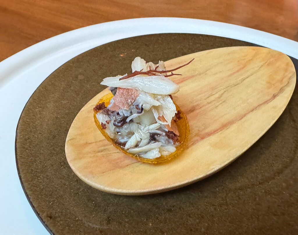 First up is the “Dungeness Crab & Kakai Pumpkin,” which might best be understood as the latest iteration of the kitchen’s longstanding work with tartelettes (both savory and sweet). The current rendition lands somewhere in the middle: combining a shell made from the titular gourd (a small, Austrian variety) with a filling made from the seeds, some finger lime, red ribbon kelp, and shreds of meat drawn from the headlining crustacean.