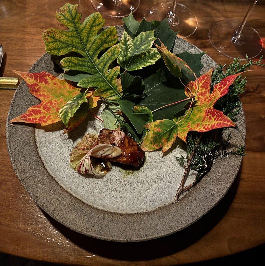 Presented opposite a surrounding thicket of leaves, the offal (draped in a piece of puntarella) forms the centerpiece of a transfixing autumn tableau. The other condiments at hand—marmite and a velvet horn (seaweed) jus—keep things simple, allowing the supreme tenderness and clean, sinew-free texture of the sweetbreads to shine. Of course, they maintain a trace of structure (which, compared to the preceding servings of seafood, makes the ingredient discernible as meat). And the resulting flavor, balancing the bitterness and sharpness of the chicory with an immense degree of brine-washed umami, is just superb. In short, this diminutive piece of thymus provides all the satisfaction I was searching for from the last few plates. It ranks as one of the highlights of the night.