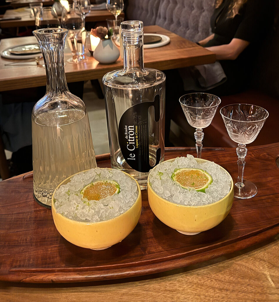 A preparation of “Satsuma Mandarin & Ginger” forms this menu’s principal dessert, and it comes presented (alongside that Le Citron du Roulot cocktail I mentioned earlier) on a neat wooden tray.
