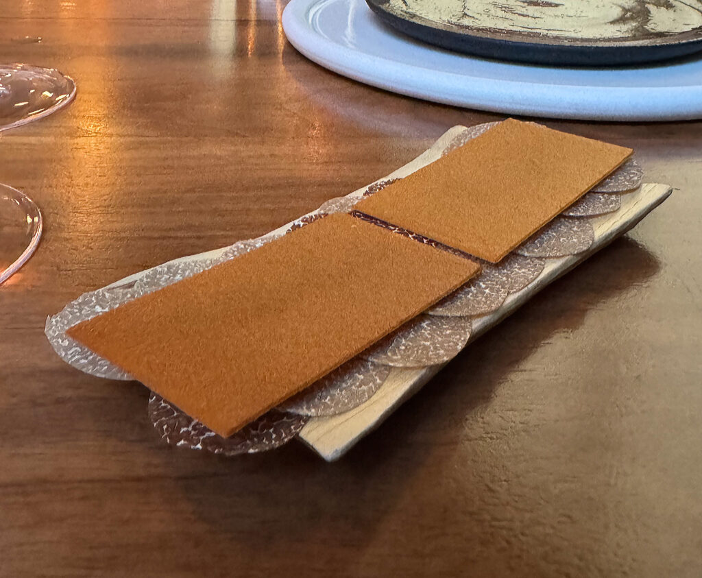 Visually, it’s hard not to marvel at how eye-catching those Italian truffles (actually a blend of black and white)—cut into perfect coins and gently arranged in a four-by-four grid—look when tucked between the two rectangular layers. Merely holding the morsel in one’s fingers and admiring its daintiness from different angles provides an immense thrill. Yet, upon reaching the palate, this wafer affirms it is more than good enough to eat. Indeed, the snap of the toasted corn cracker and its truffle filling is impeccably clean and delicate. Moreover, a hidden layer of fava bean miso ensures that the hauntingly earthy, nutty tones of the starring ingredients are matched by a sweet and richly savory notes that drive the preparation toward staggering decadence.