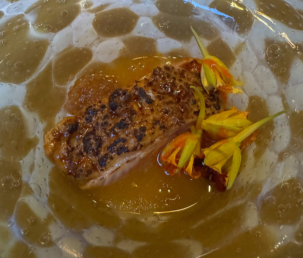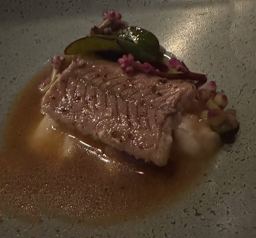 The “Rainbow Trout & Pineapple” that arrives next also references a series of recipes from the past: namely, the “Rainbow Trout & Koji Rice,” “Rainbow Trout & Blade Kelp,” “Steamed Brook Trout,” “Brook Trout & Truffle Porridge,” and “Brook Trout & Horseradish” preparations that featured during 2023 and 2024. The kitchen’s preference for the fish becomes clearer once one hears that it’s being sourced from Virginia (that very namesake and crucible of “Smyth”). Nonetheless, it’s good eating too, and accompanying notes of sea urchin (used to form a crust over the fillet’s exterior), fermented pineapple, rhubarb-stuffed nasturtium flowers, calamansi, and a serving of the roe sac totally reinterpret how the ingredient has been treated before.