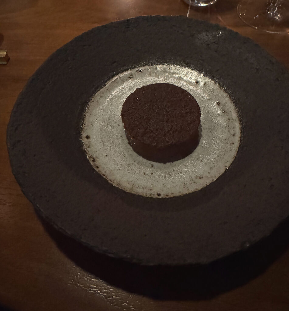 Lastly (and served separately), one finds the “Bittersweet Chocolate & Maitake Mushroom.” On paper, this seems set to be the most challenging of the bites—marrying a chocolate wafer, a gooey chanterelle ganache, and a crowning layer of that candied maitake. However, on the back of so much nuttiness and citrus (throughout not just dessert but the entire menu), it’s nice to end on a robust note of cocoa. Surprisingly, that element takes the lead here: caressing the tongue and carrying through to the finish, where the pair of mushrooms do nothing more than provide some fruity, earthy depth that harmonizes effortlessly with the dark chocolate. Overall, this may be the weakest bite of the trio, but it’s also one that remains impressively approachable despite its novelty.