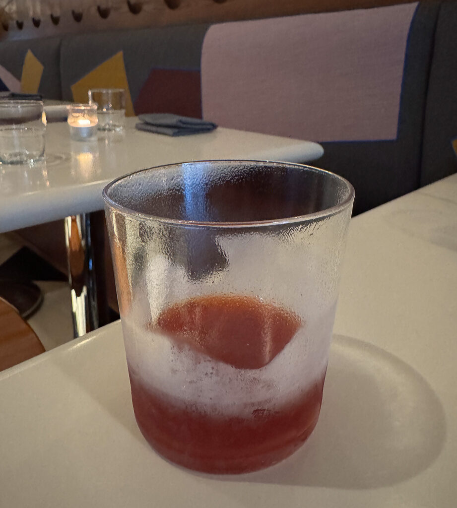 On the “Mixed Drink” side, I sample a new “House Sazerac” ($16) from Monica Casillas-Rios that ranks among the bar manager’s very best work. The blend of Cognac, rye, Demerara sugar, bitters, and Chartreuse Elixir Végétal is served in a thoroughly frozen tumbler, which serves to soften the punch of the chosen spirits. That being said, they’re by no means buried. Rather, their sharpness is beautifully integrated into a smooth, sweet package that not only concentrates everything one loves about the cocktail yet somehow improves upon it. Yes, I may be partial to Chartreuse, but substituting Herbsaint with the monks’ Herbal Elixir strikes me as genius. Overall, this is an incredible effort that ranks among my favorite tipples of the year.