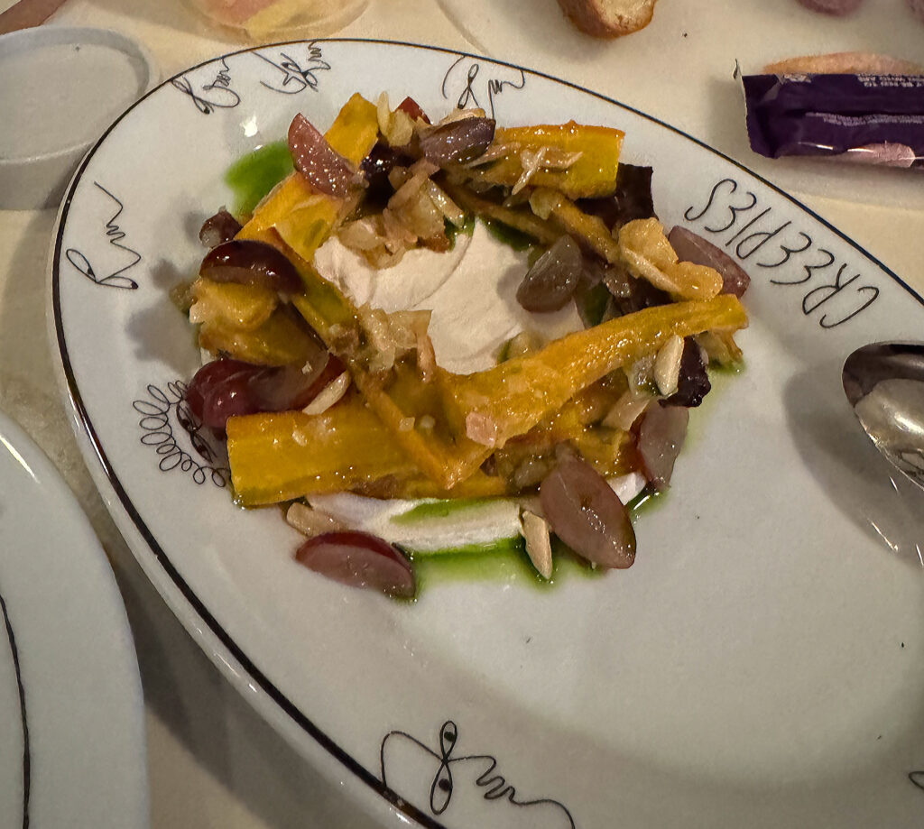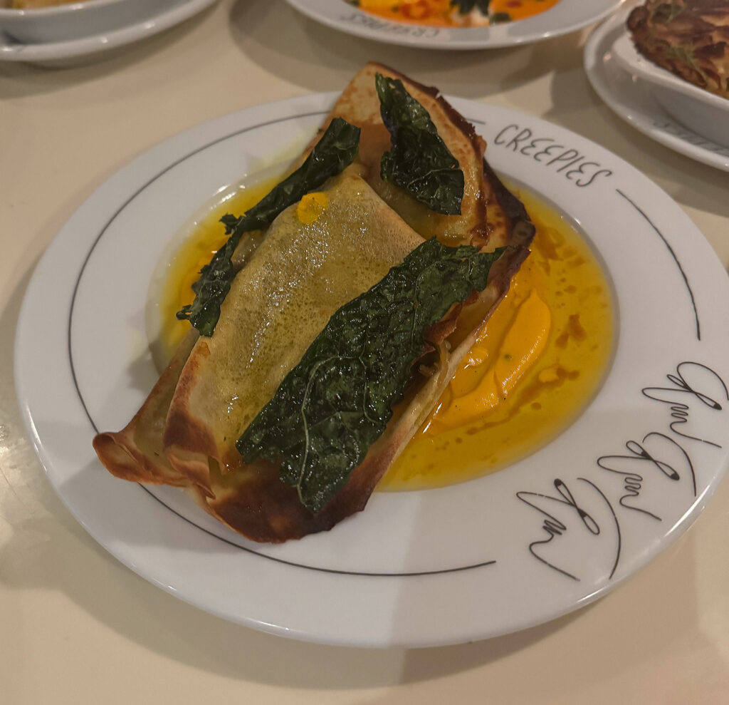 Arriving next, a ”Freekeh Crepe with Kuri Squash, Kale & Vadouvan” ($22) serves to replace the “Corn Crepe, Summer Succotash & Green Tomato” that I liked (not loved) last time. On the surface, I like the fact that this form is being used as the foundation for different seasonal combinations. Opting for freekeh (roasted green durum wheat) as a base, squash (a small, red, sweet variety) as a filling, and vadouvan (also called French curry) for flavoring strikes me as novel, yes, yet also autumnal.