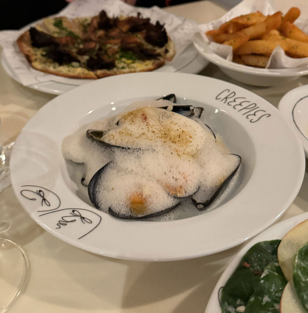 The “Steamed Mussels with Fennel Giardiniera & Pernod” ($24) stands among signatures like the gougères and saucisson. It’s execution—comprising sweet, plump pieces of the bivalve (tucked back into their shells) swimming in an anisey foam and punctuated by a touch of heat—has remained among the most consistent over time. I find both the textures and flavors to be rather elegantly rendered (almost prototypically for how Creepies looks to approach its genre) as well.