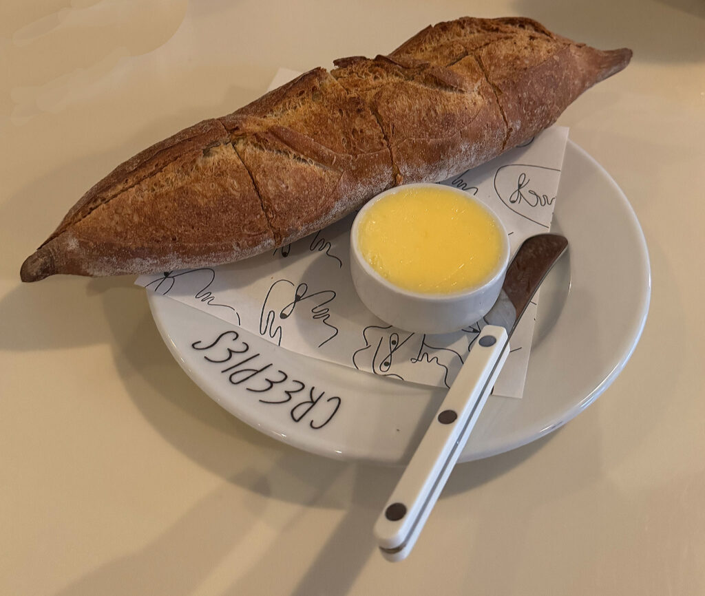 Certainly, I’d love to see this bread made from scratch, but the results were uneven. I also imagine the labor involved (on top of all the gougères, tartes, meringues, and puff pastry also being produced) eventually became disqualifying. Thankfully, with the help of Greg Wade, the baguette satisfies every expectation. It arrives warm, displays an unerring crispness (throughout the entire loaf), and possesses a crumb that is fluffy, perfectly salted, and charged with an earthy, rustic flavor. Paired with Creepies’s rich, beautifully tempered butter, this bread has finally become a standby.