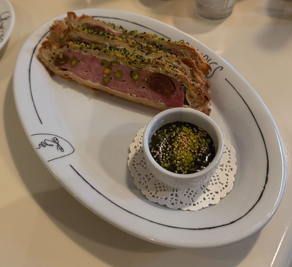 To the recipe’s credit, the sausage itself—which is made in-house and comes studded with nuts—remains superlative. It offers plumpness and moistness and a bewitching porky depth that could carry just about any preparation. Paired with the tangy, sweetly nutty condiment, it absolutely sings. However, that layer of puff pastry remains soft and loose and it totally comes apart should one attempt to cut through it. This element, which should crunchily crown the saucisson, still feels more like a sad, tattered wrapper. Its presence does not totally spoil the dish, yet it does leave me craving the higher pleasure I know it is capable of achieving.