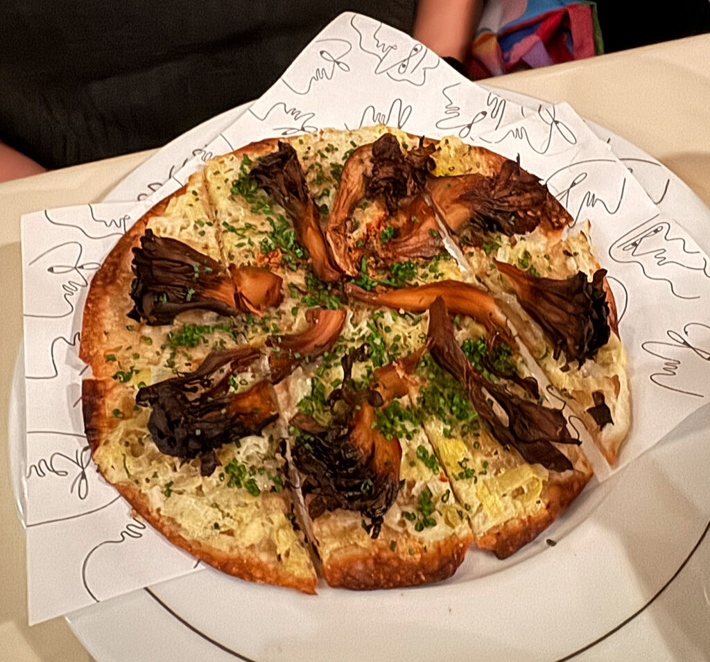 Thankfully, the “Tarte Flambé, Tavern Style” ($16) more or less fulfills its status as one of the restaurant’s most emblematic dishes. This play on the Alsatian flatbread (combining fromage blanc, onions, chives, and maitakes on a pizza-style crust) has not really changed from my last visit. It delivers a light, crisp base texture that transitions seamlessly to the creamier, sweet-and-savory toppings. The very tops of the mushrooms, by my measure, have been charred a little too much on this occasion. Yet their base remains pleasantly meaty, and the overall experience—charged with tang, earth, and allium—still makes for a reliable crowd-pleaser.